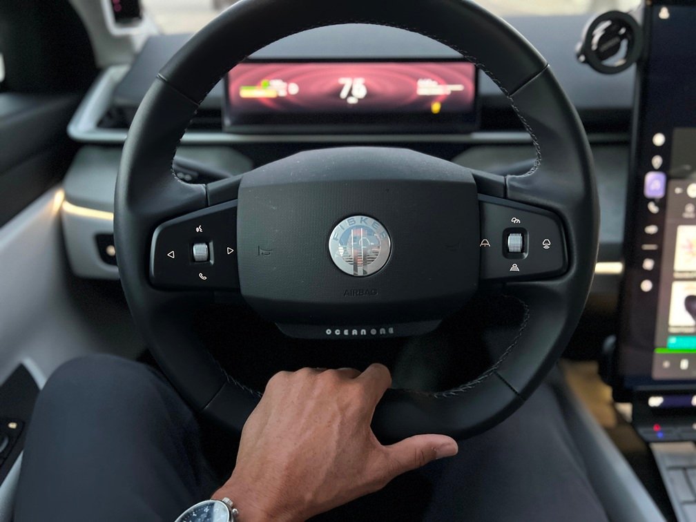 When I first test drove the car back in December 2023, one thing I noticed was the steering wheel felt odd. It wasn’t a round, soft cushion steering wheel like what I had in the Polestar. It was more of a rounded triangular shape that seemed to put pressure on the lower palm as you gripped it. But after the first 30 minutes or so of driving, I felt no pressure. Maybe because I wasn’t in tense LA Christmas traffic at The Grove, and more that the steering wheel is a flat bottom steering wheel. And in addition to that, there’s sort of a channel or a carving out of the lower corners of the flat bottom that provide a nice resting spot for your hand. I spent most of the time driving on the highway with the hands in a very relaxed position at the bottom of the steering oil with a comfortable grip if I needed to make a quick lane change.