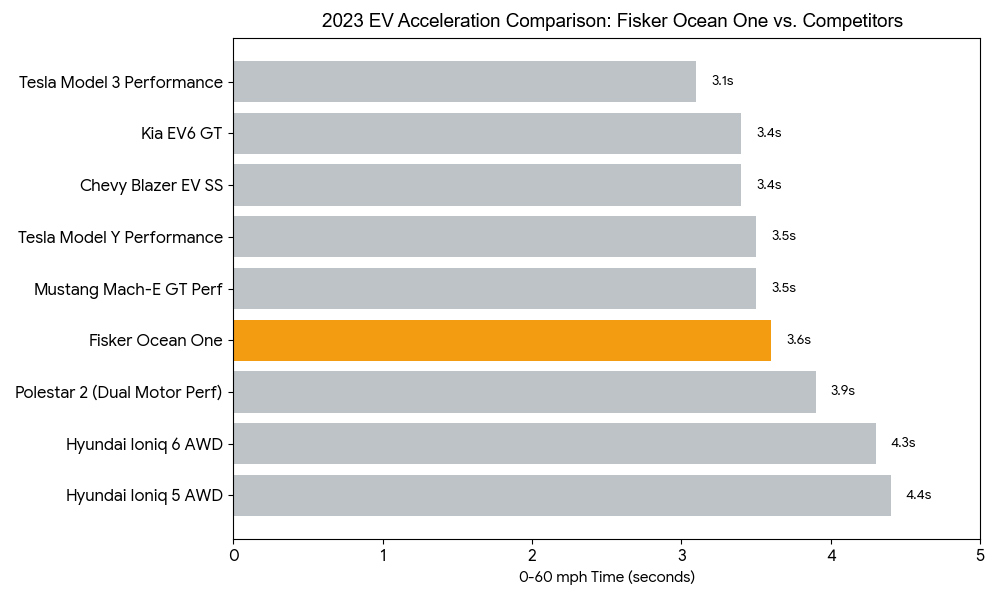 As you can see, the Fisker Ocean One’s 3.6-second time remains incredibly competitive, beating out the dual-motor Polestar 2 and the AWD Hyundai Ioniq 5 and 6 models. Although the price point of the Fisker may have been higher than some models, it allows the buyer to make an informed purchased decision.