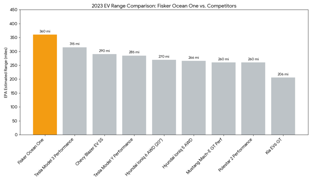 At it’s time of release, the Fisker Ocean One had the longest range by a long shot. Even the Tesla Model X, not included due to price range differences, could not surpass the Ocean, with it’s average of 345 miles. Only the Lucid line of cars offered more range at the time, with the base model Pure offering 410 miles.