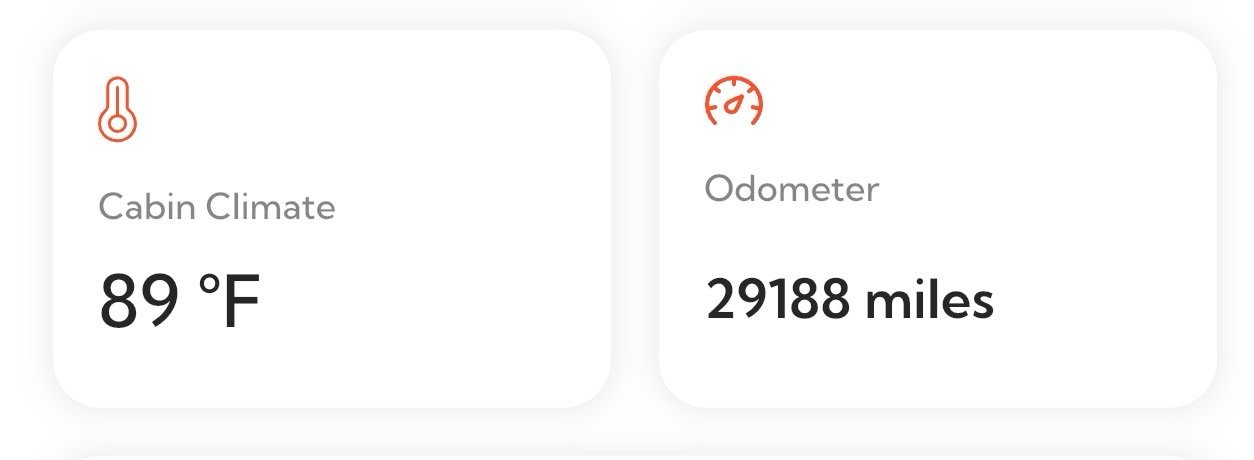 - Cabin climate: I can see the cabin temp and confirm coolness, if needed. Unfortunately, no way to reset the temperature at this time. So on cool nights, where I may raise the temp, or even turn the HVAC off, I can’t restart or reset to a cooler temp. But that could change soon.